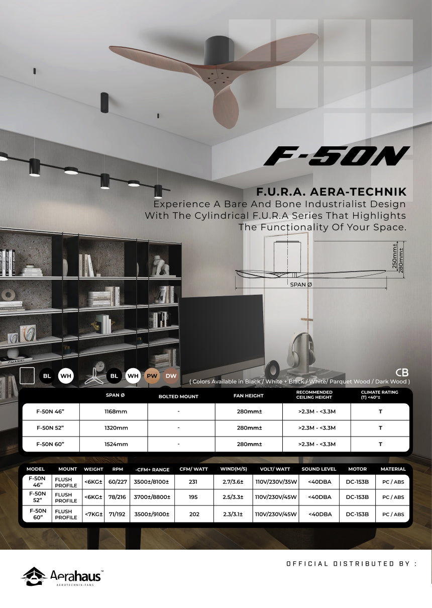 Featuring a Trim Edged Blade Assembly and solid construction from singular PC/ABS built form, The F-50N delivers intense yet muted wind for your living spaces. Crafted with a thoughtfully designed straight curved tip, the F-50N series delivers intense and direct airflow to a concentrated surface area beneath the fan, keeping you cool and comfortable all day long. With its signature bare outook, the F-50N fans are the same, making it the perfect choice for homeowners who crave uniqueness and distinction.